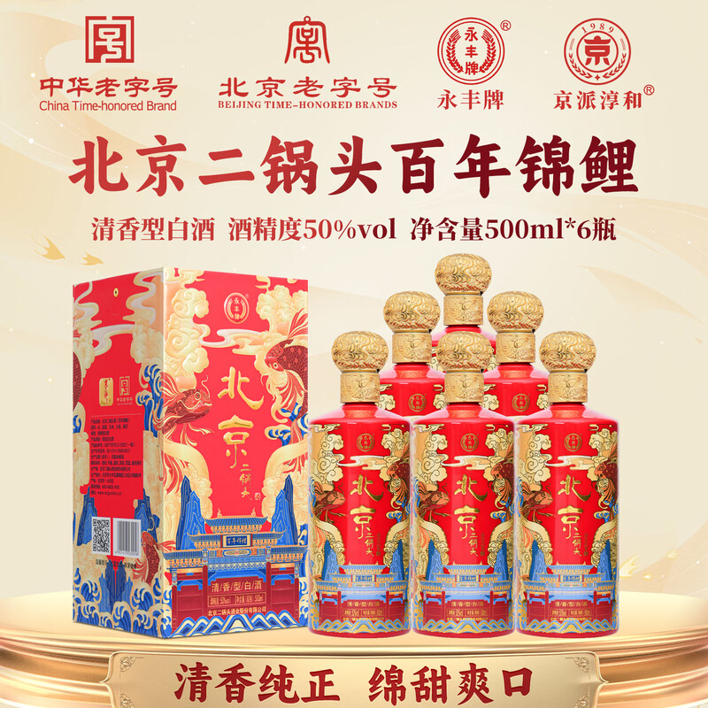 永丰牌 北京二锅头百年锦鲤 红 50度 清香型 固态法纯粮食酒白酒 送礼 500mL*6瓶 整箱装